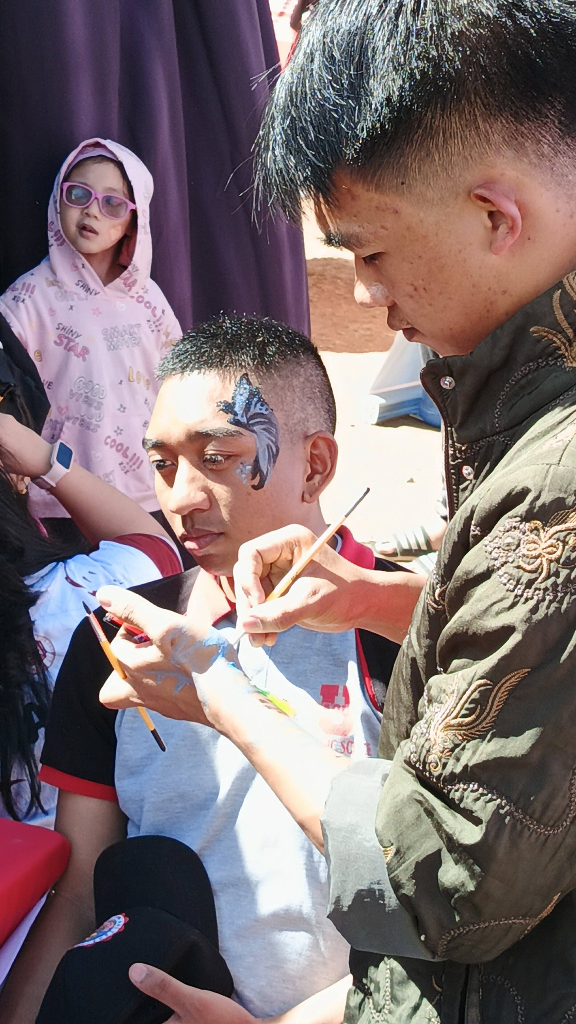 Students, faculty, and volunteers from different departments worked together to create booths and activities for families. A highlight was the free face painting booth. Kids picked flowers and created fun designs with joy. Families also enjoyed pot painting and coloring activities. They laughed and spent time together, making the moment special.